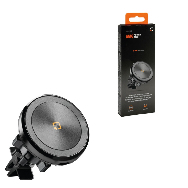15W máx. Entrada tipo C. Compatibilidad: universal, aplicando el disco metálico al exterior de la caja; iPhones con tecnología MagSafe (12.ª edición en adelante) y fundas con MagSafe; Línea MagCase Optiline.