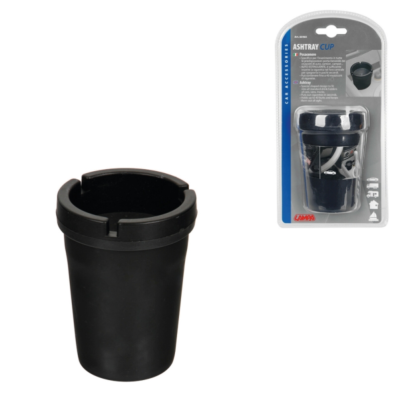 Se adapta a los arreglos de portavasos de tableros de automóviles, camiones y autocaravanas. Simplemente inserta el cigarrillo en el orificio central para apagarlo en unos segundos. Puede contener hasta 40 colillas de cigarrillos.
