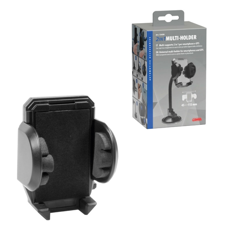Cubierto internamente en gomaespuma. Adecuado para usar con cable de alimentación o auriculares conectados a la unidad. Función de liberación automática presionando el botón. Fijación mediante clips para boquillas de ventilación o ventosas para el anclaje en superficies lisas. Brazo flexible de 18,5 cm. Base adhesiva incluida. Extensible para sostener objetos de 45 a 115 mm