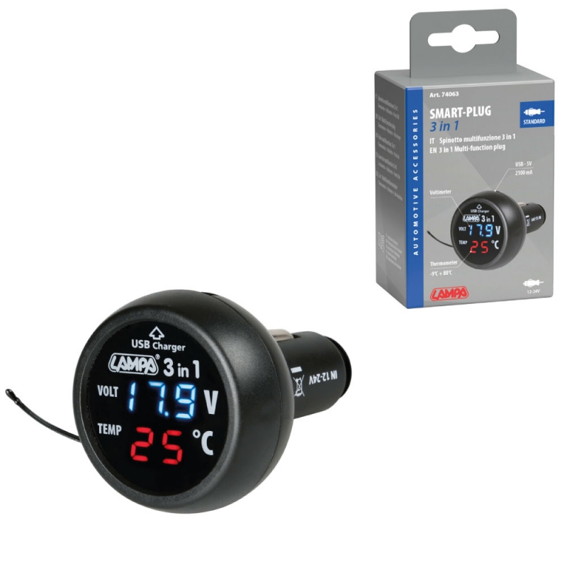 Termómetro para indicar la temperatura dentro del habitáculo (-9 ° C / + 80 ° C). Voltímetro de 12 / 24V para controlar la carga de la batería y el buen funcionamiento del alternador. Toma USB, 5V, 2100 mA para conectar y cargar cualquier dispositivo que funcione a través de una toma USB