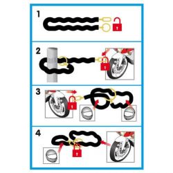 En acero cementado con sección cuadrada de 8 mm. Cerradura cilíndrica reforzada con placas a prueba de brocas. Recubrimiento de cadena de nylon antiarañazos. 3 llaves suministradas