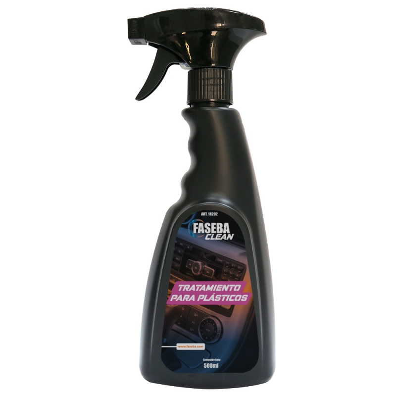 The treatment for Plastics Faseba Clean 500 ml has been developed for Restore, protect and enhance The aspect of plastic surfaces in vehicles, both inside and outside. It is ideal for applying in Bumper, moldings, splashes, door panels and plastics Exteriors exposed to the sun and the weather.