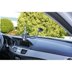 Indently covered in pourelle. Suitable for use with power cable or headphones connected to the unit. Automatic release function by pressing the button. Suction cup to anchor on smooth surfaces. Flexible arm of 25 cm. Supplied with fixing for the direct coupling of the monitor and adhesive base.