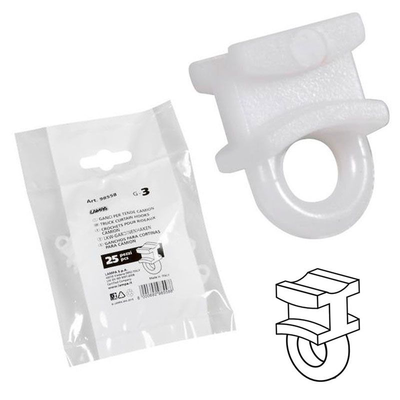 If you need hooks for truck curtains, you are in the right place. On Faseba We have the best hooks for market truck curtains and at the best price. This concrete hook corresponds to the G3 model. In each plastic bag you can find up to 25 pieces to have several spare hooks. These hooks are available in white.