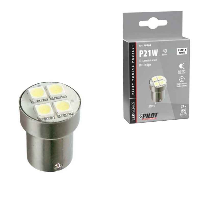 Pièces 18.5x30 mm par emballage: 1 Autres: 4 x 3 Chips SMD Volt: 24V Lampe: (P21W) Attaque: Ba15S Luminosité: 6500K Lumen: 40 LM LED: SMD Export@lampa.it • Technologie SMD • Système multi-puces • Très longue durée de vie non approuvée pour l'utilisation de la route. Utilisez-le uniquement dans la compétition ou les véhicules d'exposition, pour une utilisation hors route ou sur des routes privées.