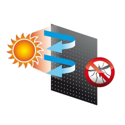Polyester à 100% double couche. Deux fonctions: parapluie, pour protéger l'intérieur et les passagers du soleil, sans bloquer la visibilité vers l'extérieur; Réseau d'insectes, pour empêcher les insectes de pénétrer même avec des cristaux bas. Il n'empêche pas l'ascension et le déclin du cristal.